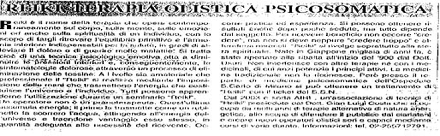 Un operatore non è un pranoterapeuta. Quest’ultimo accumula energia; il primo la trasmette come un rubinetto fa scorrere l’acqua, attingendo all’energia dell’universo e traendo vantaggio esso stesso, in quantità adeguata alla necessità del ricevente. Occorre pratica ed esperienza. Si possono ottenere risultati anche dopo poche sedute, ma tutto dipende dal soggetto. Per ricevere beneficio non occorre “credere”, ma non si deve neppure “credere troppo” e attendersi miracoli, “Reiki” si rivolge soprattutto alSintonia spirituale. Nato in Giappone migliaia di anni fa è stato riportato alla ribalta all’inizio del ‘900 dal dott. Mikao Usui. Non iterferisce con altre terapie ne con i medicinali, di cui anzi potenzia i principi attivi. La medicina tradizionale non lo riconosce. Però presso il reparto di medicina Psicosomatica dell’ospedale san Carlo di Milano si può ottenere un trattamento di Reiki con Ticket del S.S.N.